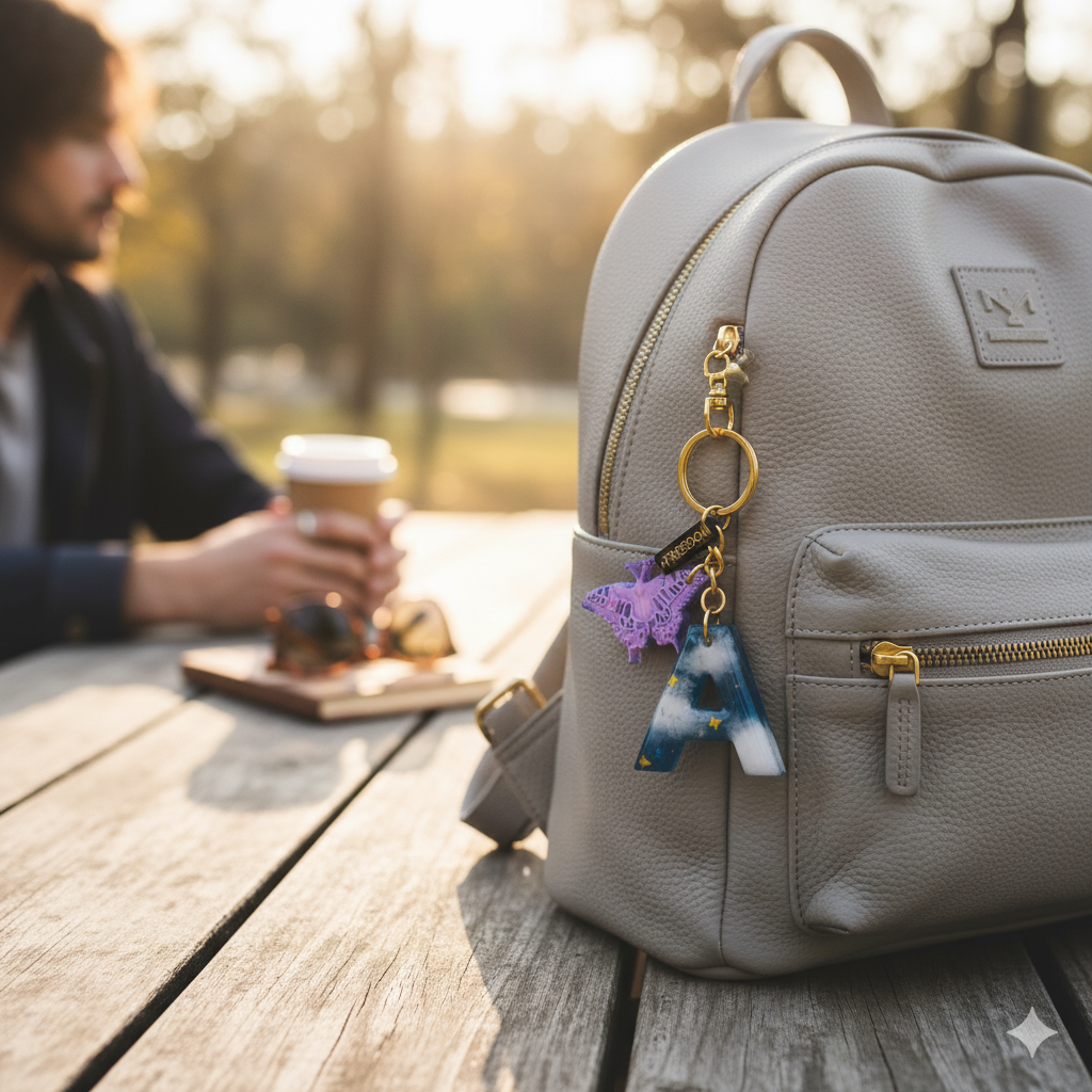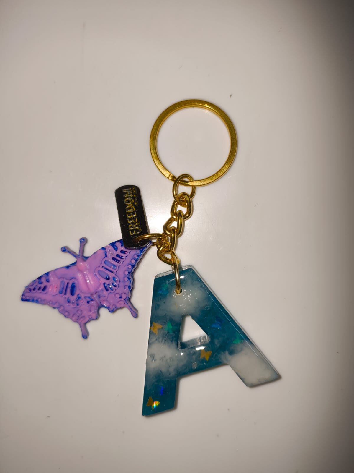 This personalized keychain blends symbolism and charm with a dreamy blue resin letter \”A,\” infused with a cloudy gradient and golden star accents. Dangling beside it is a vibrant lavender butterfly charm and a small antique-bronze tag engraved with the word \”FREEDOM\”. Together, they create a playful yet empowering design—perfect for those whose name starts with “A” or anyone drawn to a theme of self-expression, growth, and wanderlust.