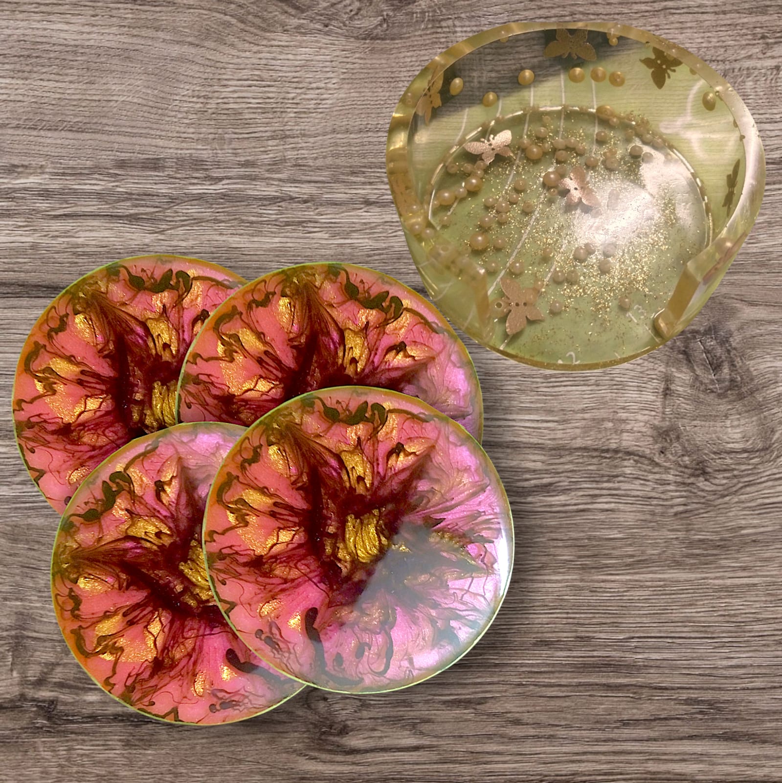 Infuse your space with warmth, artistry, and elegance with our Handmade Fiery Bloom Resin Coaster Set with Matching Bowl. This eye-catching set features four round resin coasters in a dramatic pink and gold burst design with dark, smoky accents that resemble blooming flames. Paired with a complementary resin bowl in soft golden tones adorned with butterfly motifs and pearl-like beads, this set blends functional design with captivating beauty.
