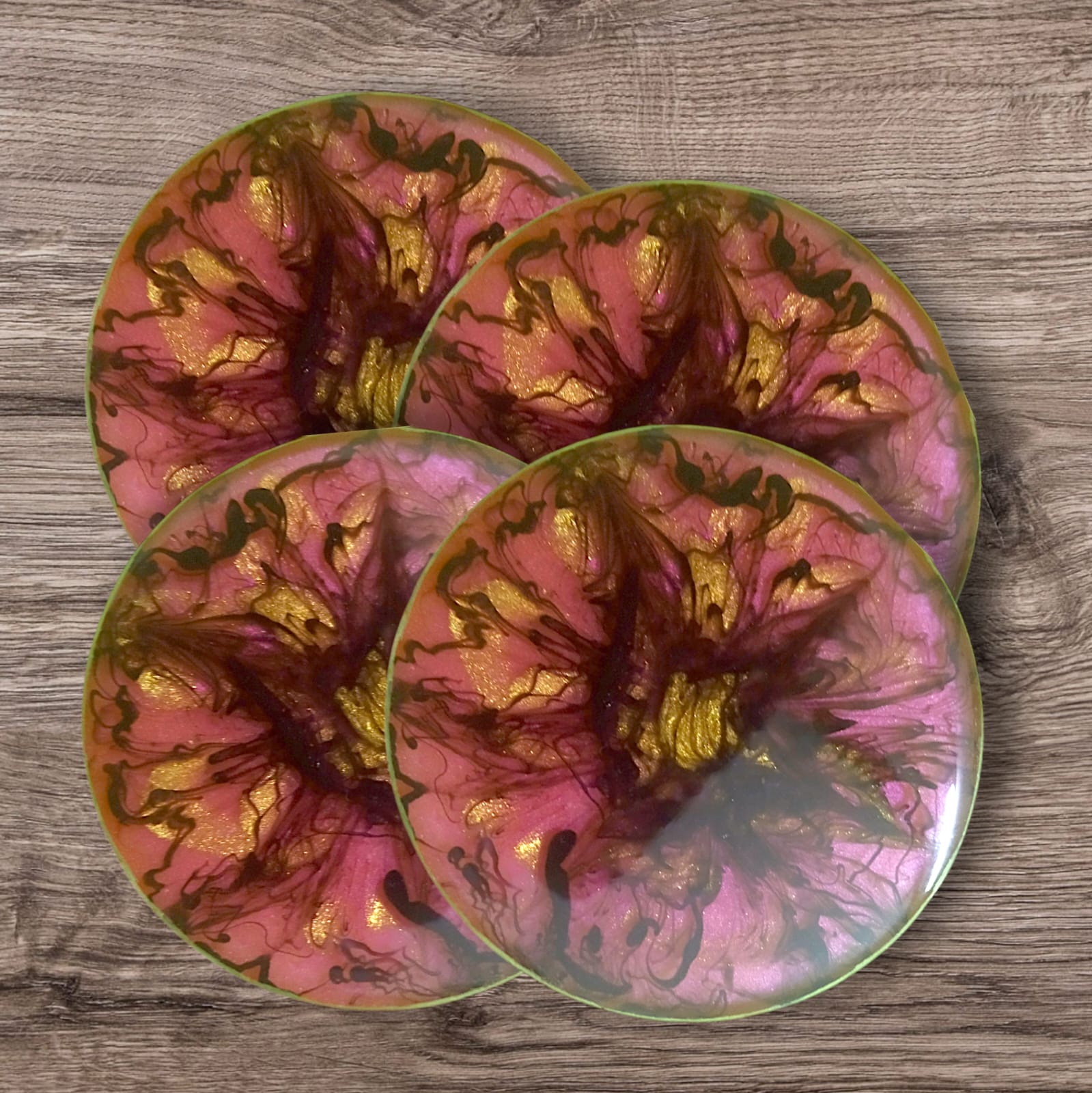 Crafted with premium-quality epoxy resin, each piece is heat-resistant, waterproof, and easy to clean, making them perfect for everyday use or special gatherings. The bold, swirling colors and shimmering gold details make this set a standout addition to any home décor or a unique, thoughtful gift.